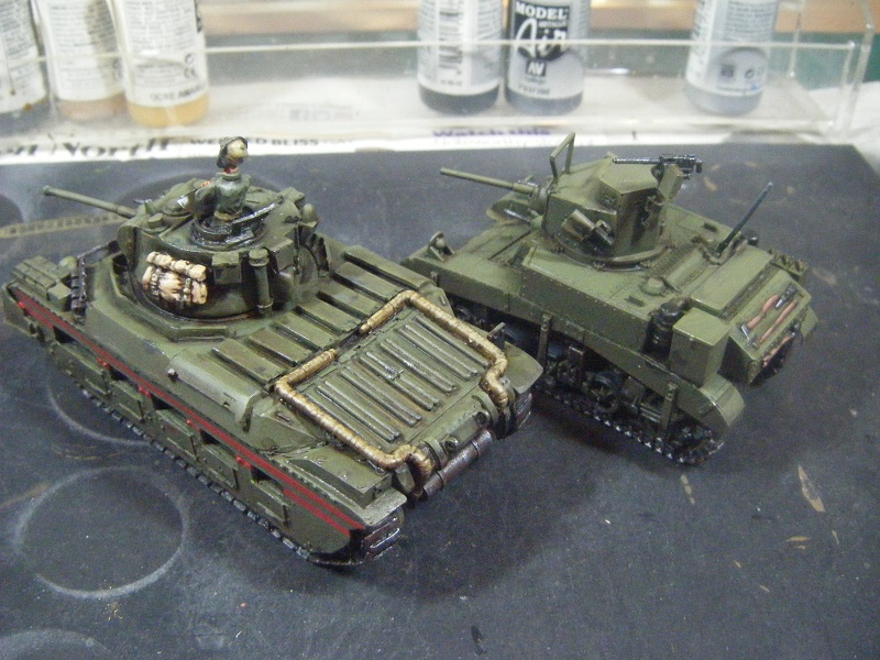 As you can see, I've also done the red lines on the sides of the Matilda. And glued the M3's MG back onto the post (it was too narrow to drill for pinning, so I'll need to be careful with it).